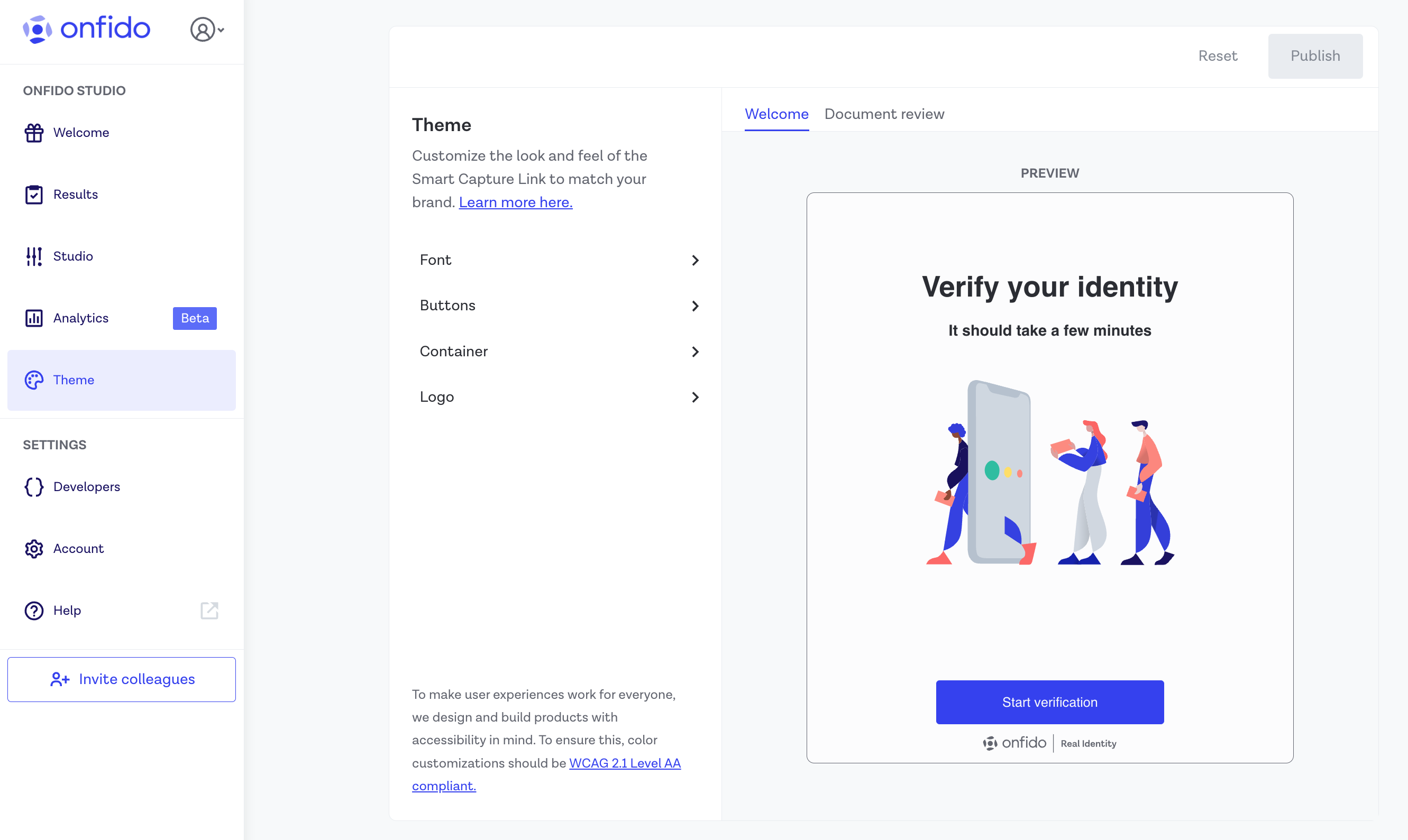 Please note: The toolbar preview is merely an example of the Welcome and Document Review screens of the verification flow, not an exact replica of the SDK user interface. If you want to see the real changes, click Publish in the toolbar to save the configuration, then preview with a specific workflow.