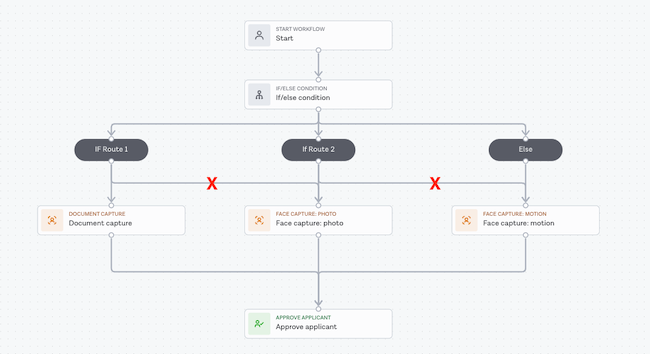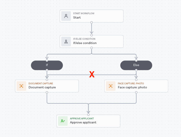 In the first example shown below, the condition of a logic task leads to two branches: the left branch runs a Document Capture task, while the right branch runs both the Document Capture task and a Face Capture: photo task in parallel, before rejoining the workflow path.