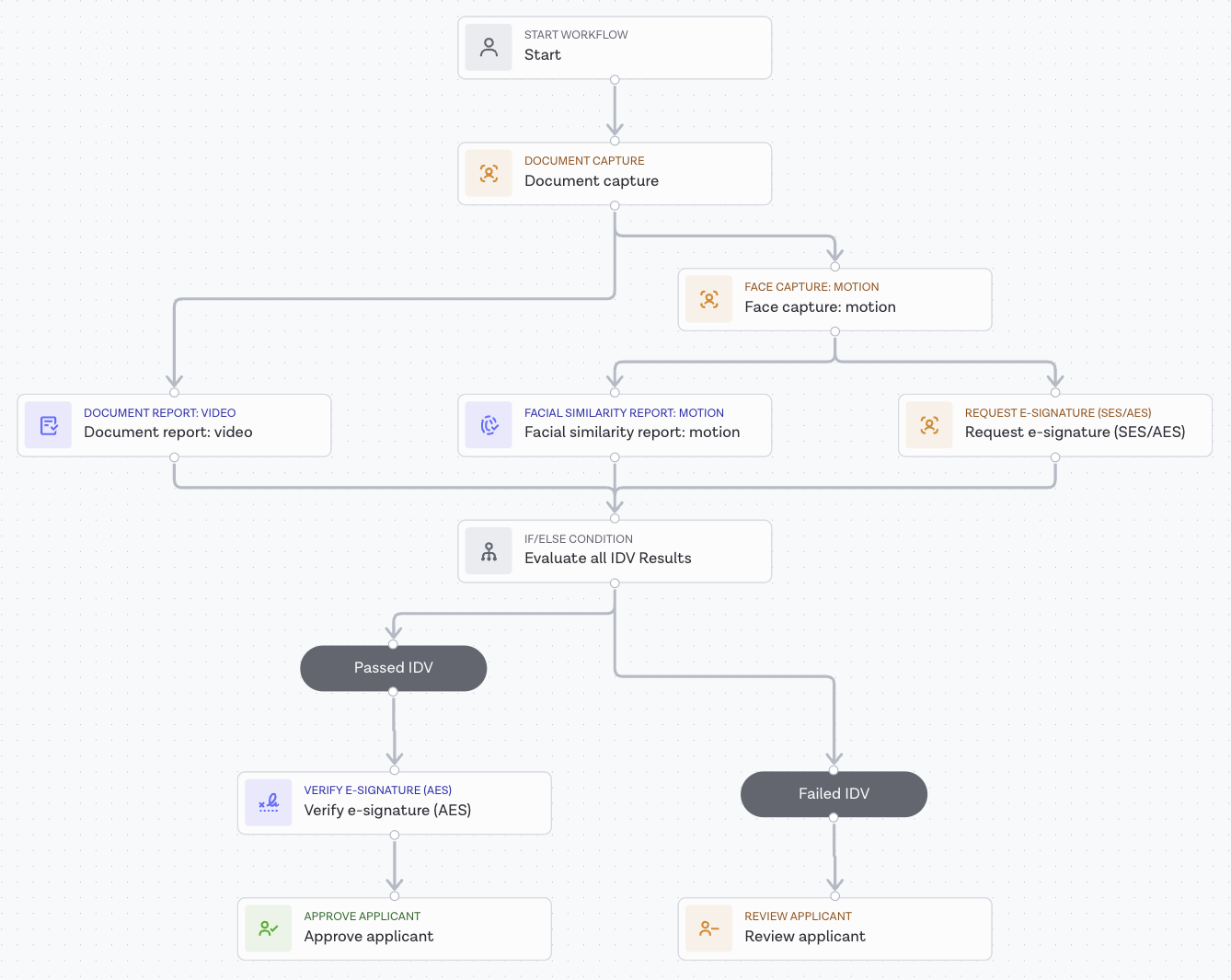 To satisfy compliance regulations, it is essential that the identity of the signer be verified, meaning the workflow must also contain a Document Report and a Facial Similarity Report.