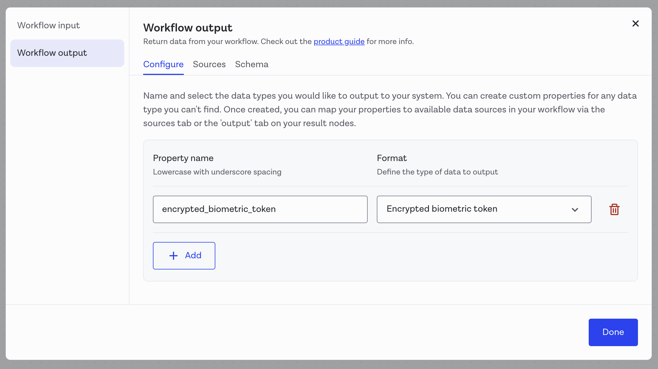 The encrypted biometric token is returned to your infrastructure by means of a webhook. For the webhook to contain the encrypted biometric data, the token must be configured as a workflow output. This must be configured as custom output data of semantic type Encrypted biometric token. You must then set up a webhook for Entrust to return the encrypted biometric token that is generated from the original media back to your infrastructure.