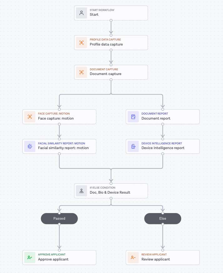 Furthermore, because the report collects device integrity information through a media upload (such as a document, live photo or live video capture), a Device Intelligence Report task must always follow the route of a Document Capture task or a Face Capture task in order to extract the appropriate input data. Because of this, the applicant's first name, last name and a media ID are mandatory task inputs.