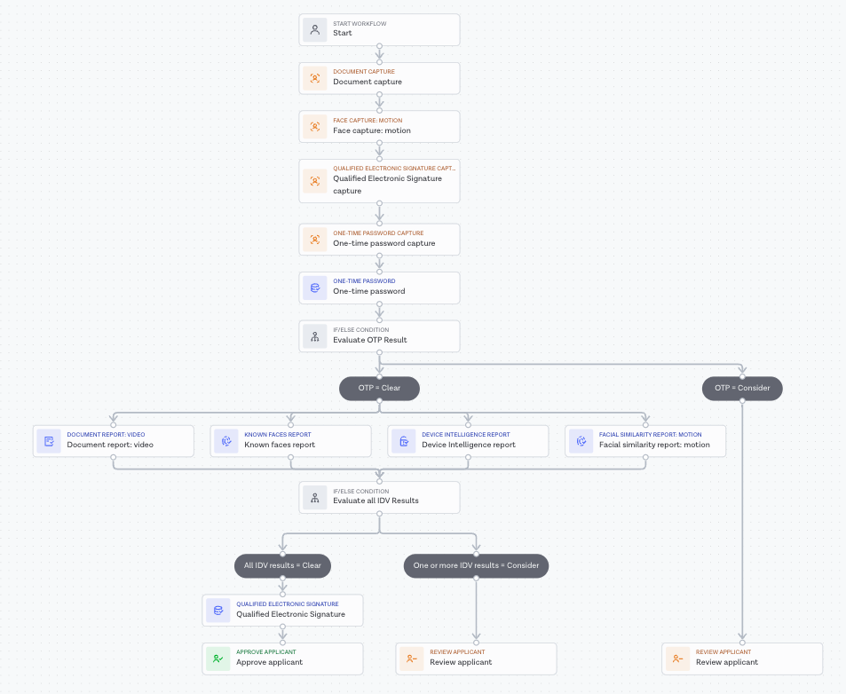 Onfido generally recommends that clients configure and maintain separate workflows for each regulated IDV context, as requirements tend to differ from one country to the next. This will make it easier to maintain, analyse and optimise your workflow performance over time, while making the necessary changes to remain compliant.