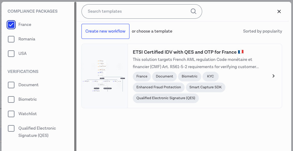 To get started with your ETSI certified IDV with Qualified Electronic Signature workflow, select a template from the Template modal in the Workflow Builder. The templates have been designed for use in different countries, therefore select the template that best suits your needs - for example the "ETSI Certified IDV with QES and OTP for France 🇫🇷" template.