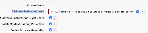 - Change the "Clickjack Protection Level" to "Allow framing of site pages on external domains (Good protection)"