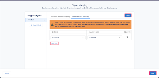 - Click Add Row to add Onfido's fields to the Salesforce Fields (Note: If there are fields that are unmapped they will be removed.)