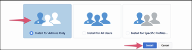 Install for Admins Only is recommended. This option allows for controlling access and permissions after the package has been installed. For further information, you can refer to the Salesforce documentation on Package Installations.