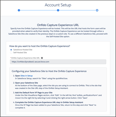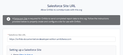 Now you will have to enter the URL of the Salesforce site that will be used to accept status updates and other data coming from Onfido